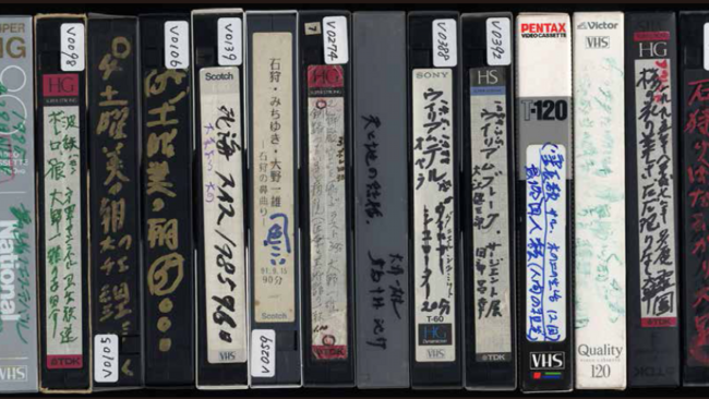 (写真上:大野一雄氏所蔵のVHSテープ 下:アーカイブ展示風景)