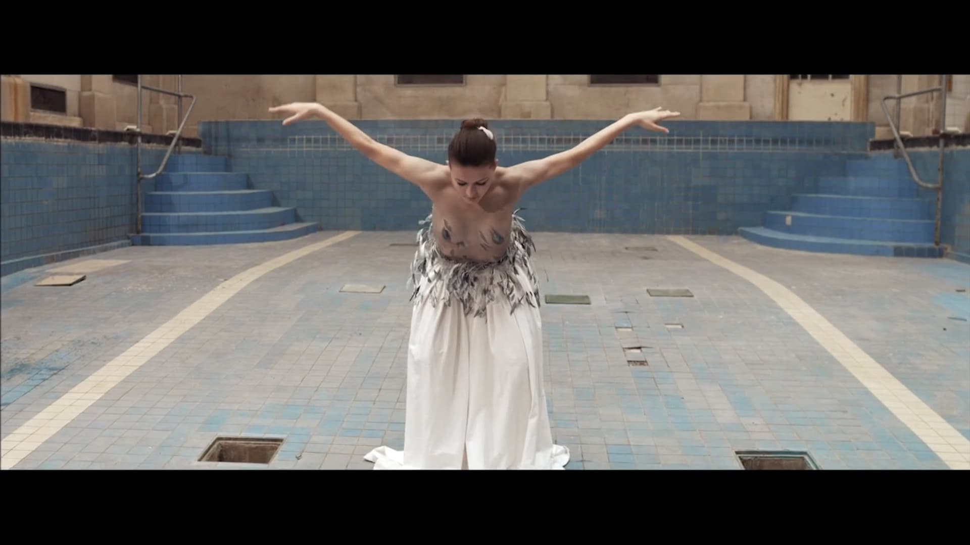 Actually there are three worlds in the film. First world is shot on black horizont with first appearance's of detailed dancer body represents pregnancy or kind of prenatal eagle stadium before being born. Second world (old swimming pool) where the eagle is born has many different meanings but main idea is to represent kind of “ nest" or "safe house" from where small eagle can observe whole new world around from. Third world - beautiful open scenery of yellow sand, blue sky and magnificent clouds represents freedom and life with all its majestic beauty. This two worlds we also used due color inversion - blue swimming pool and yellow walls above it turns into blue skies and yellow sands below it. In the last sequence of the movie with all three eagles together we are again in the swimming pool area but this time colors are gone. Image is almost monochromatic to create almost monumental, cathedral like effect with three kind of goddesses in its full power and beauty.