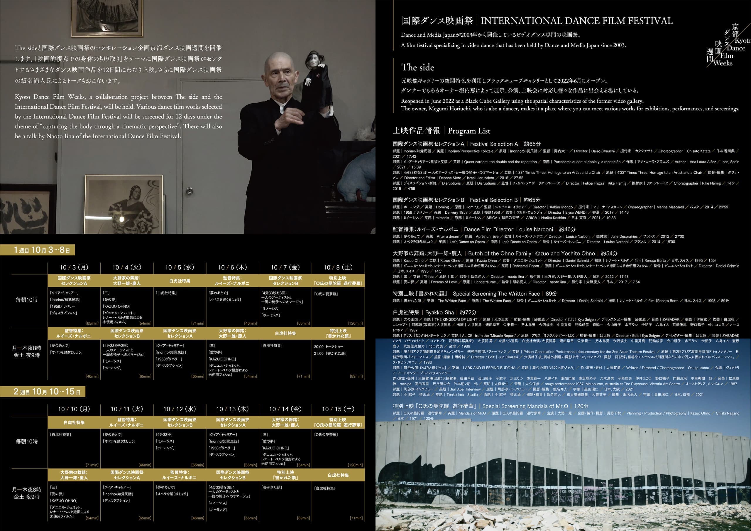 KYOTO DANCE FILM WEEKS is a collaborative project by The side and Dance and Media Japan. Dance films selected by Dance and Media Japan will be screened at The side, an art gallery run by dancer Megumi Horiuchi.