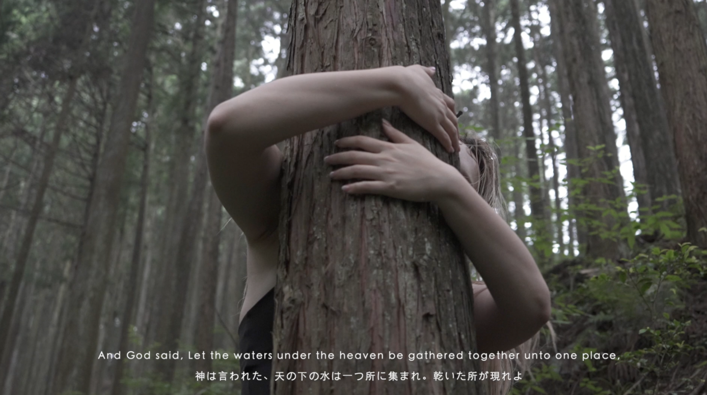 この映像作品の制作過程では、奥多摩の原始森が撮影地として選ばれました。当初の予定では晴天での撮影を想定していましたが、不運なことに大雨に見舞われました。最終的には薄暗く湿った雰囲気の中でこの映像作品を完成させることとなりました。作品中に表現された湿った雰囲気と身体の融合は、森林での芽生えるテーマを意図したものと意外なほど調和しています。また、私が「聖書」の「創世記」から一部の言葉を引用し、天地が分かれる初めの混沌とした感覚を表現しました。この映像作品は私にとって完成した状態ではなく、天候の影響で第二の激しい部分や舞踏の一部がうまく表現できなかったこと、そして地球との共鳴する第三の部分では、より自然なリズムの音を見つける必要があります。さらに、背景のナレーションには「創世記」の内容を用いましたが、音声では逆再生の処理を施しました。作品中のテキスト部分は、神の意志によって世界が創造された「創世記」の一節を示しており、全てが始まる原初の時代に戻った時、神の意志がなければ我々の世界はどのように創造されるでしょうか、という問いを考えることを希望しています。