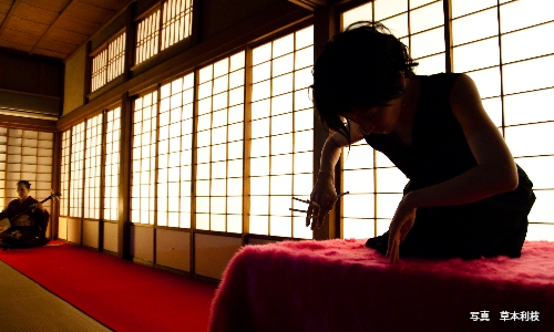 「お寺でダンス? 江戸唄でモダン・ダンス?」という、似合うかどうかの不安というか疑問は、すでにパンフレットのビジュアルで、私の中では解消していた。布咏師匠と寺田さんの凛とした立ち姿でそれは充分に納得していた。問題は具体的な限られたスペースの中で成立するのかどうかだった。廊下に沿って締められた障子と座敷に横長に設定された観客席とで奥行きはあまりない。だが、これが逆に見事な三層の空間演出で昇華されていく。