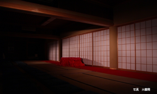 門構えを潜り抜けるとすぐ左に、真新しい印象の建物が見え、その入口に公演の受付があり、奥の間に通される。部屋の中に入ると、畳の大広間のほとんどを埋めるように、観客が座っている。舞台になるのは、障子の前に細長く取られたスペースのみだろうか。横長に並べられた、畳用の簡易座椅子と座布団につめ合わせて座る観客たち。地域の集会に居合わせたような気になる。広間という場所にいると、身内的な雰囲気が生まれてくるのはなぜだろうと思う。ここは寺だよなあと、どことなく所在なさげになりながら座る。