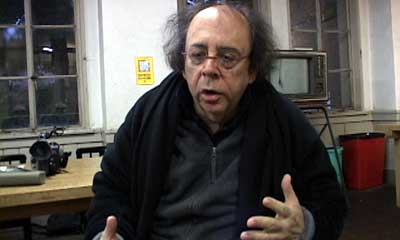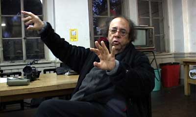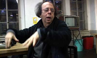 会場となっている廃校の小学校に入ると、なんかブツブツ言いながら廊下を歩いているオジさんが・・・。ああ、やっぱり、リチャード・フォアマンだ。インタビューが始まって、とりあえず僕もヤケクソで行き当たりばったりで質問してしまえー、と思っていたので、「何年も前にアナタの演劇を見たけど、まったく意味が分からなくて悩んだんだけども」と切り出すと、「みんな、そう言うよ。」「ストーリーが演劇をつまんなくしてる」などなど強烈な持論で語りだす。話を聞いていると、わざと大げさな事言ってみたり、センチメンタルな感じもしたり、おどけてみたり、人生について語ったり、と、何しろ面白い。怖いような、温かいような、不思議な語り口調とパフォーマンス。「子供のような、天才のような、ただの爺さんのような・・・」そんな感じ。でも、パンク精神は貫かれていました。ちなみに、69歳。