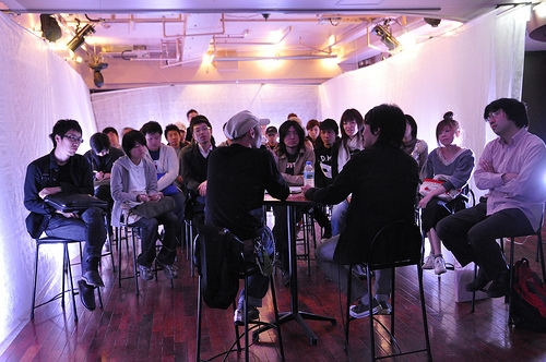 トークセッションでは、仙台を拠点に世界で活躍するクリエイター集団wowに参加されている長崎智弘氏(wowlab)。身体表現とメディアテクノロジーの関係や、メディアとは何か、という面白い話ができました。