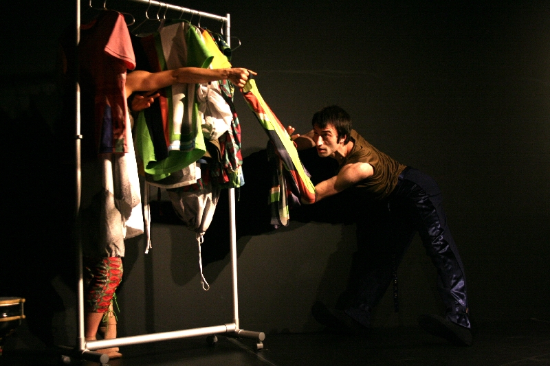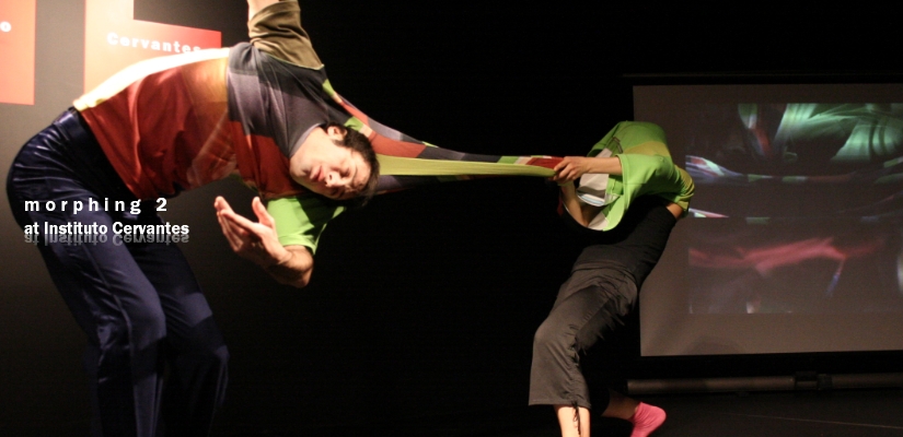 『Morphing/モーフィング』のコンセプトは、変容していく体。衣装は、さとうみちよによるデザインで、使われたテキスタイルは荒川修作+マドリン・ギンズの「三鷹天命反転住宅」のパーツを写真撮影し、生地にプリントしたもの。2人のダンサー(アレッシオ・シルヴェストリン、杏奈)は、シャツを伸ばしたり、丸めたりと、服を使ったコンタクトインプロビゼーションのようなスタイルでパフォーマンス。映像(飯名尚人)は、その伸びた生地をその場で撮影し、リアルタイム・エフェクトをかけた映像によって抽象絵画のようにデザインされる。