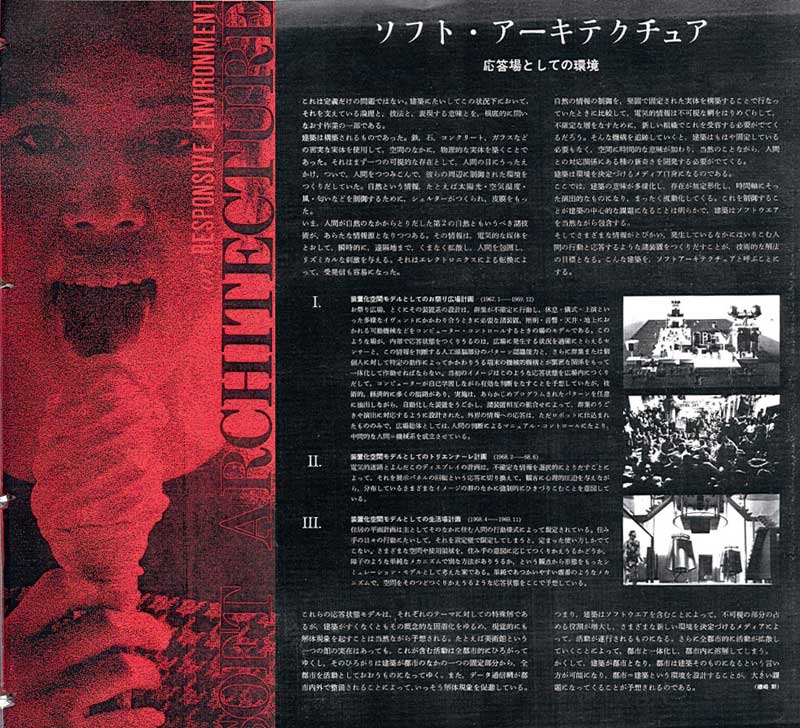 「建築は環境を決定づけるメディア自身になるのである。ここでは、建築の意味が多様化し、存在が無定形化し、時間軸に沿った演出的なものになり、まったく流動化してくる。これを制御することが建築の中心的な課題になることは明らかで、建築はソフトウェアを当然ながら包含する。そしてさまざまな情報がとびかい、発生しているなかにはいりこむ人間の行動と応答するような諸装置をつくりだすことが、技術的な解法の目標となる。こんな建築を、ソフトアーキテクチュアと呼ぶことにする。」