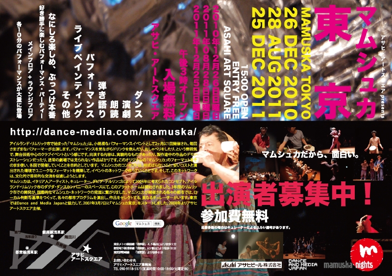 マムシュカは、アイルランドで始まったパフォーマンスイベントです。持ち時間10分間。ダンス、演劇、音楽、大道芸、、、何をしても構いません。お客さんは、自由におしゃべりしながら、ウロウロしながら、ビール飲みながらパフォーマンスを見ることができます。