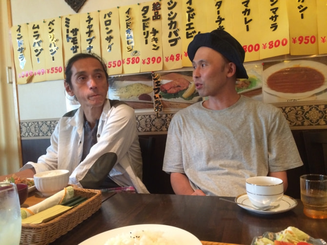 昼休憩。ポツポツと雨が降る中、昼食を求め上星川駅まで歩いて戻る。大野一雄舞踏研究所は、上星川の丘の途中にある。機材がないと行き来は楽。駅前で独特の雰囲気を放っていた多国籍料理屋に入る。川口さんと飯名さんは舞台版「大野一雄について」海外公演の打合せ中。生姜焼き定食、パスタランチ、インドカレー定食を食べる。