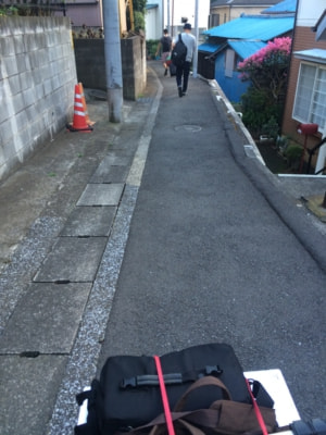 相鉄線上星川駅にて飯名さん、パフォーマーの川口隆夫さんと合流。映像版「大野一雄について」の主なロケーションである大野一雄舞踏研究所へ。機材をのせた台車を押し、坂道の住宅街を進む。途中から階段道になり、機材と台車を3人で担ぐ。