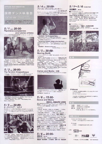 2006 第3回DMJ国際ダンス映像祭/P-house http://www.dance-media.com/videodance2/2006.htm 2018-2019 トップページ 2015 トップページ 2014 上映作品2013エディション上映若手監督クリエイションパフォーマンスデジタルアーカイブ展示会 場 2013 トップページ上映作品|スケジュール写真展示トーク会場アクセスお問い合わせオープニングイベント 2012 イントロダクションエントリー上映作品学生監督クリエイションパンフレット ダウンロードワークショップ 2 実践編ワークショップ 1 基礎編会場アクセスお問い合わせ 2010 introschedule / ticketprogram 4月29日(木・祝)program 4月30日(金)program 5月1日(土)program 5月2日(日)workshopaccess 2009 introcommentatorprogram 2月7日program 2月8日workshop archives 2008200620042003