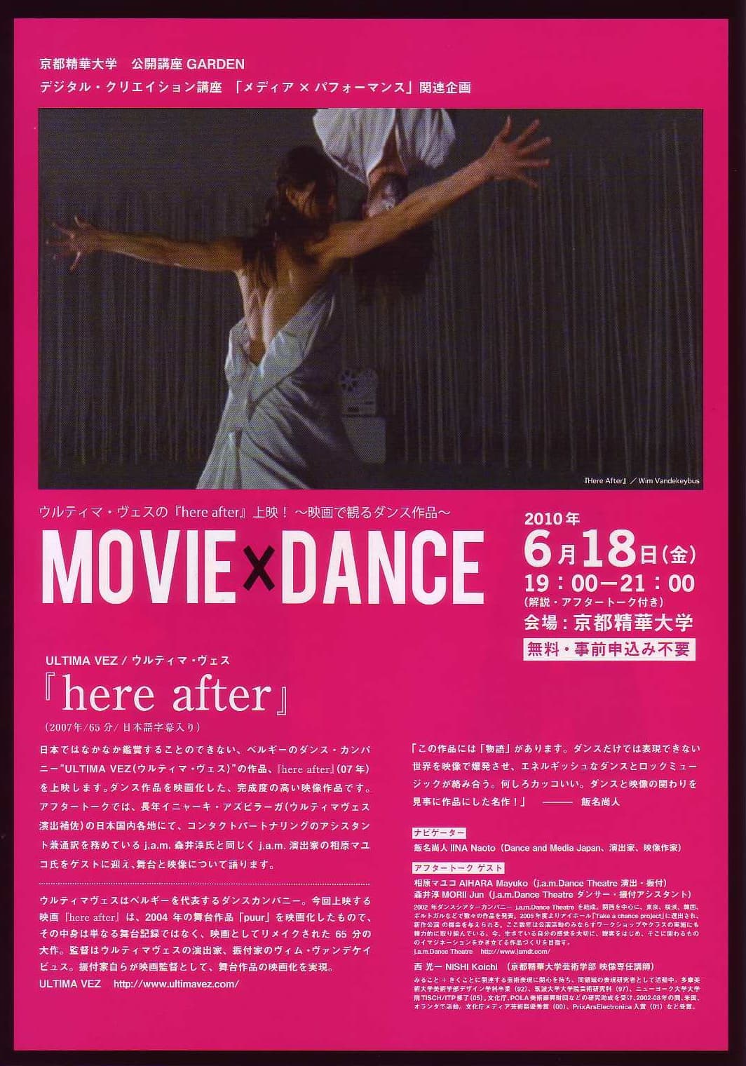 日本ではなかなか鑑賞することのできない、ベルギーのダンス・カンパニー“ULTIMA VEZ(ウルティマ・ヴェス)”の作品、『here after』(07年)を上映します。ダンス作品を映画化した、完成度の高い映像作品です。トークでは、長年イニャーキ・アズピラーガ(ウルティマヴェス演出補佐)の日本国内各地にて、コンタクトパートナリングのアシスタント兼通訳を務めている j.a.m.森井淳氏と同じく j.a.m.演出家の相原マユコ氏をゲストに迎え、舞台と映像について語ります。