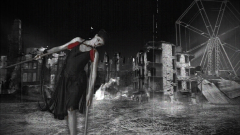 戦争?核?隕石の衝突?荒廃的な都市に、松葉杖の女性。松葉杖が機関銃のように攻撃的だ。ゲームの中に入り込んだような作品。アニメーションと実写をミックスしたビデオダンス。