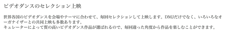 セレクションの基準は「第6回DMJ国際ダンス映画祭」の中で4人のコメンテーター(白井美穂、水野立子、村井雄、飯名尚人)が「これ、面白い!」と言った作品を選んでいます。