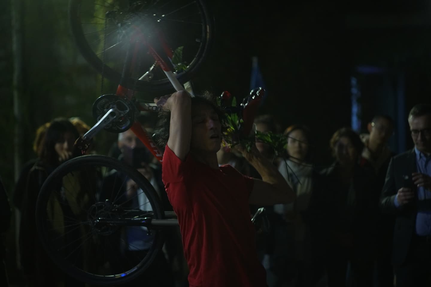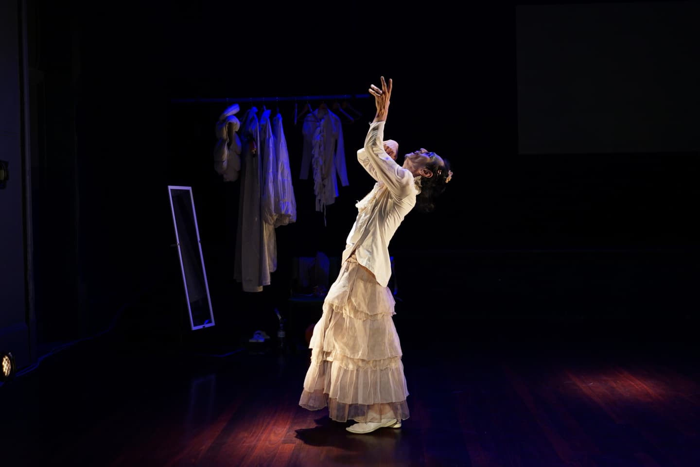 観る者はそこに生前の大野の面影を重ね、大野を知らない者もまた、そこに大野の踊りを想像し重ねます。そうして複数の像が交互に前に出あるいは後退する。『大野一雄について』は、今は亡き大野一雄との、幻のデュエットを踊る作品です。