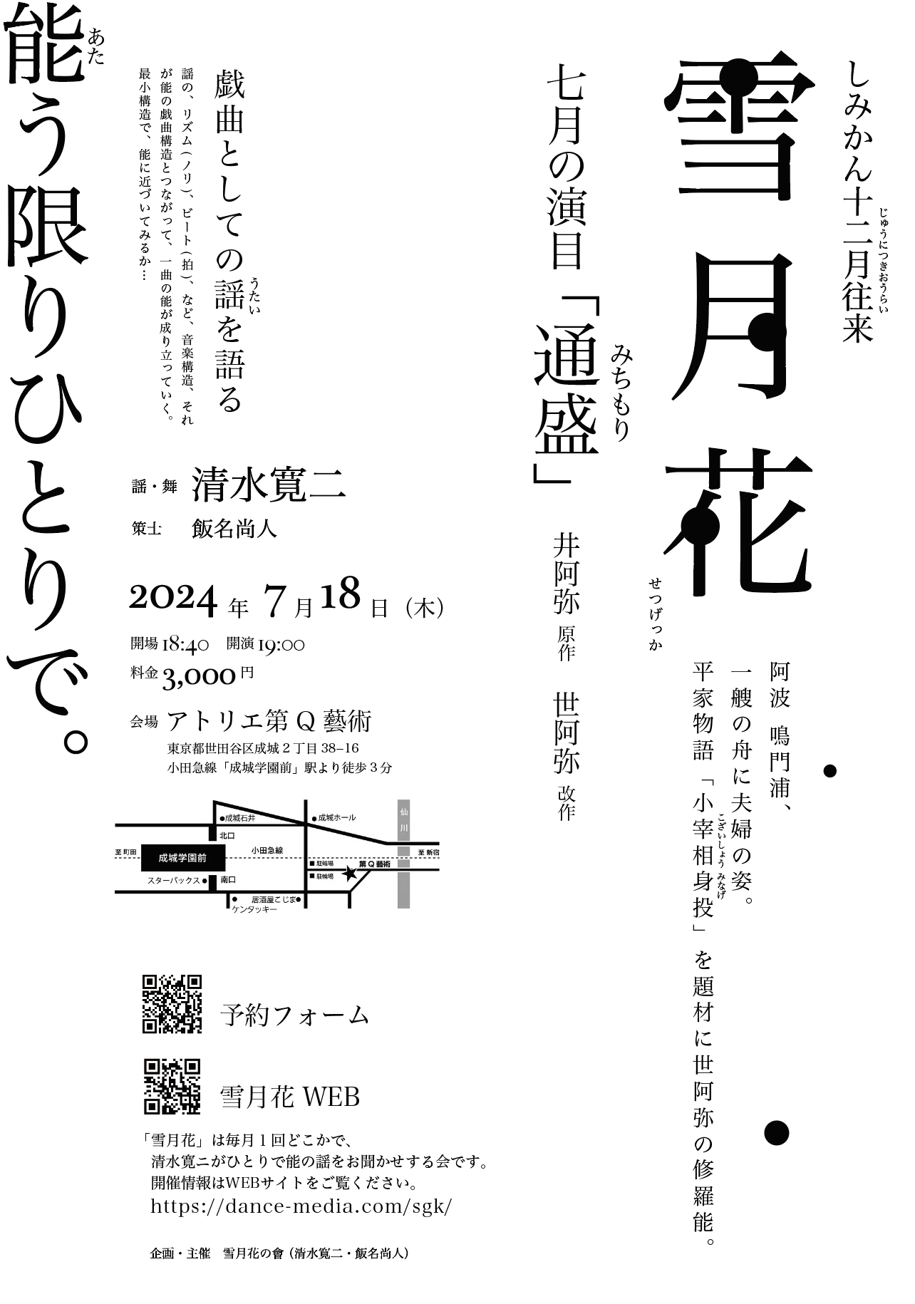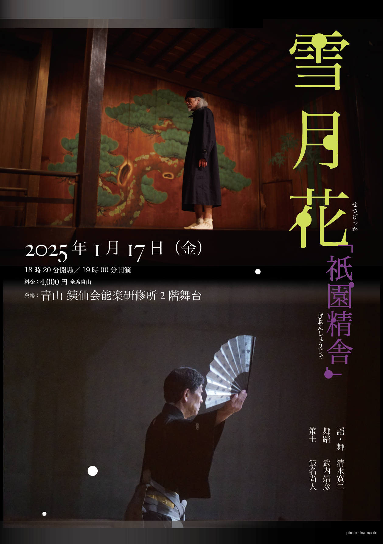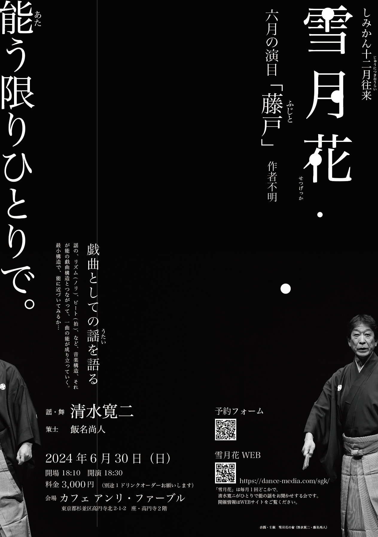 能の様式を削るだけ削って、それでもこれは能である、というものを見つける実験もしくは挑戦。︎季節、場所に合わせた演目で、毎月どこかで清水寛二がひとり能を演じます。