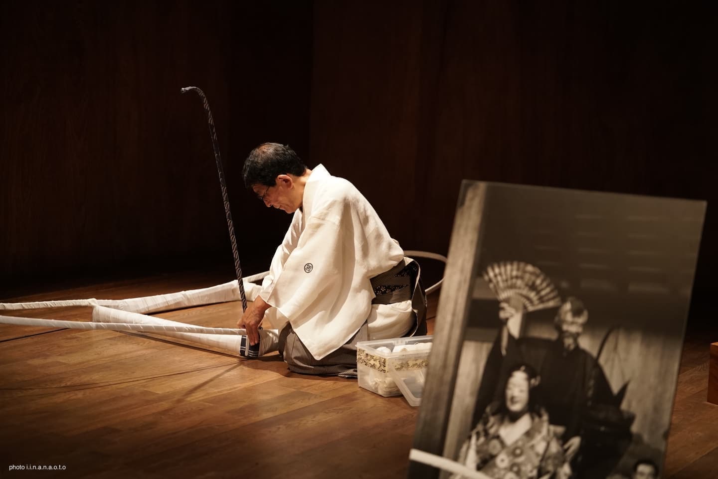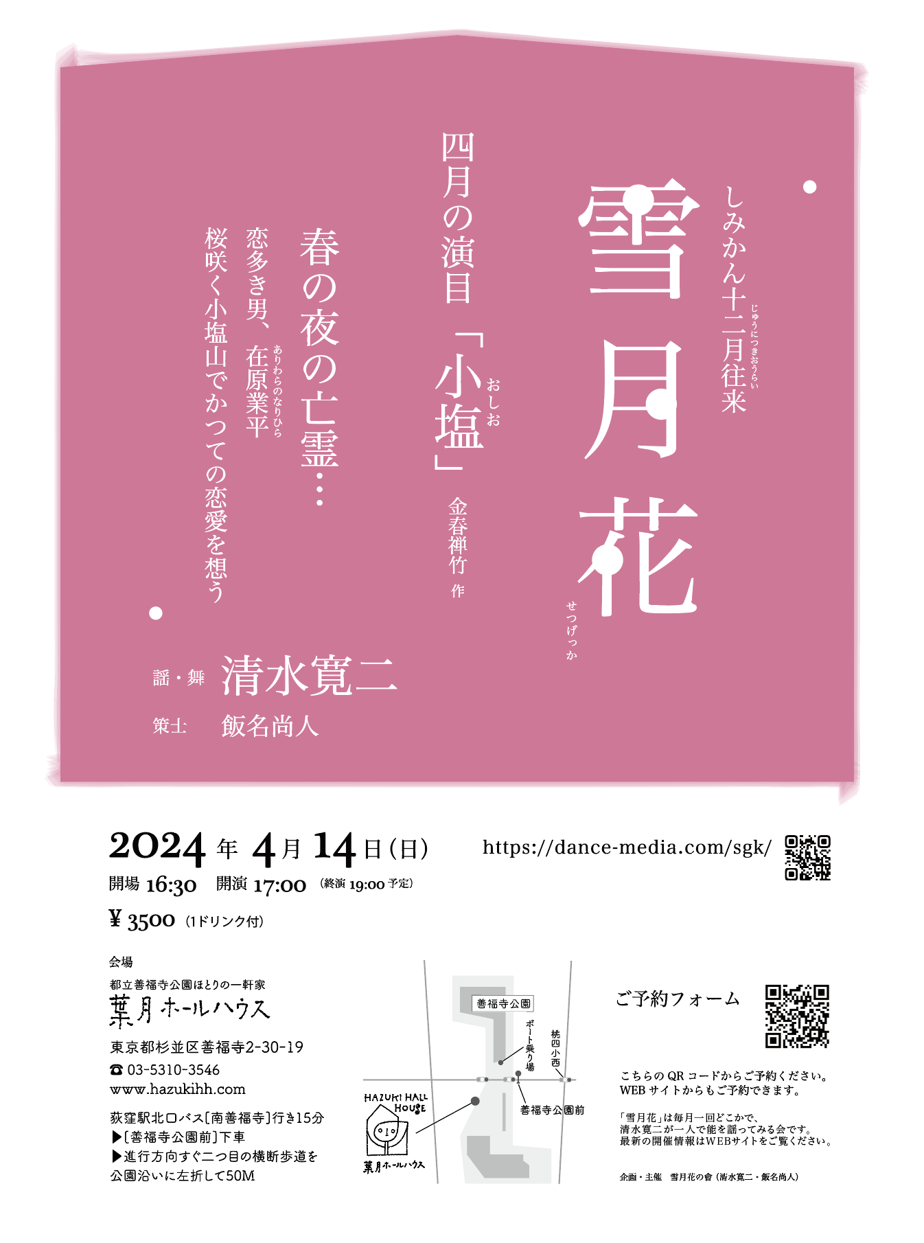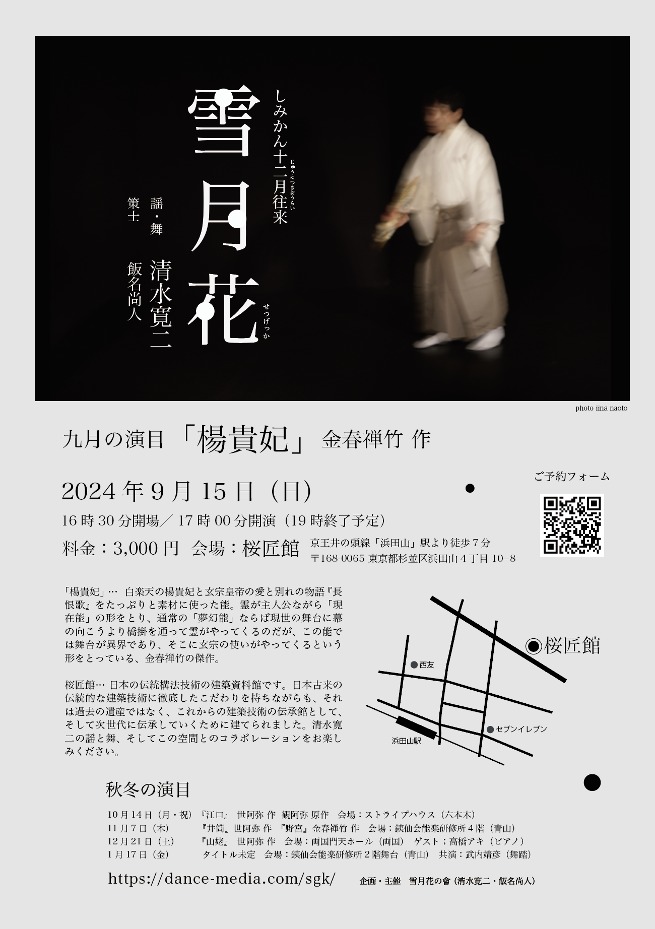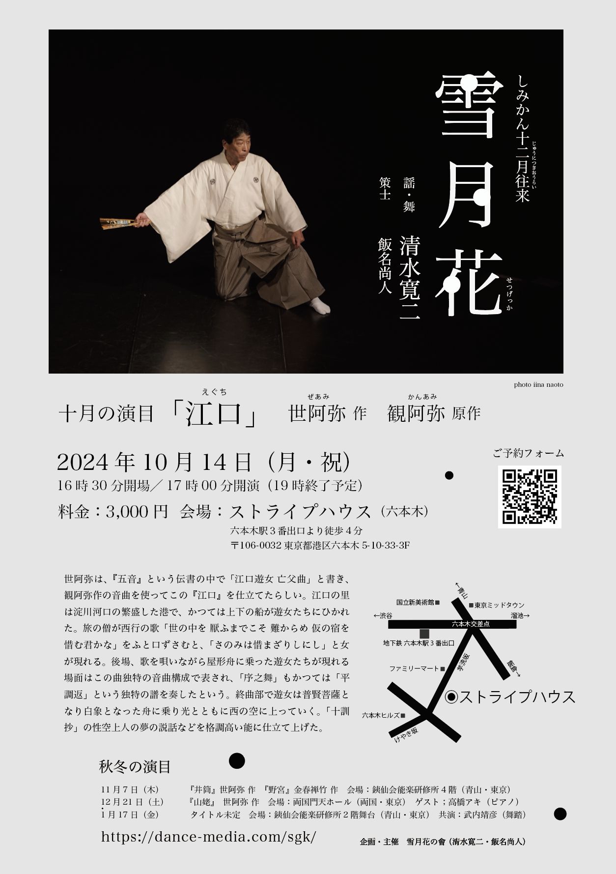 能の様式を削るだけ削って、それでもこれは能である、というものを見つける実験もしくは挑戦。︎季節、場所に合わせた演目で、毎月どこかで清水寛二がひとり能を演じます。