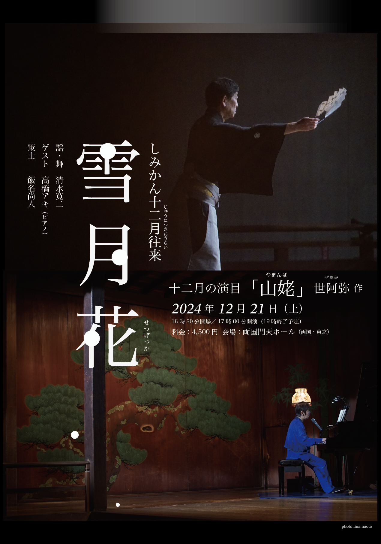 さて、しみかんも十二月を巡って最終回。能『山姥』の『雪月花之舞』という小書(異演出)では雪月花三段の舞を舞う。今回は高橋アキさんによるピアノ版“雪月花” を。